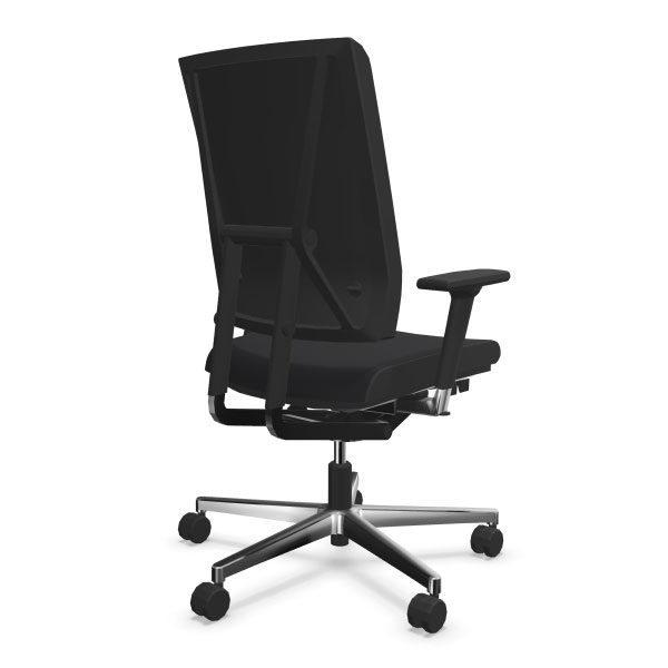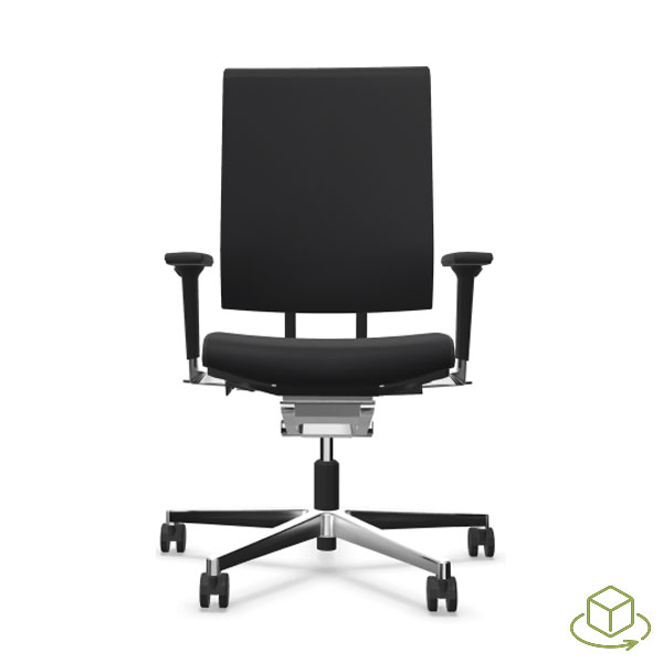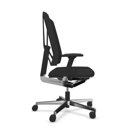 Mécanisme point synchrone 4 positions de blocage avec effet anti-retour. Réglage d’inclinaison avant de l’assise inclus. Réglage ultra rapide de la tension du dossier. Réglage de la hauteur d’assise par vérin pneumatique de sécurité. Dossier avec «système pendolo» pour une assise dynamique. Dossier réglable en hauteur. Assise et dossier en mousse de polyuréthane haute performance. Également disponible avec assise et dossier de couleurs différentes (revêtements de même qualité). Tissus tendus non collés. Piétement en fonte d’aluminium poli équipé de roulettes à double galets auto-freinées pour sol moquette norme EN 12529. Structure en aluminium poli, composants polyamide et polypropylène anthracites. Assise avec passepoil (bordure latérale) cuir noir ST610.