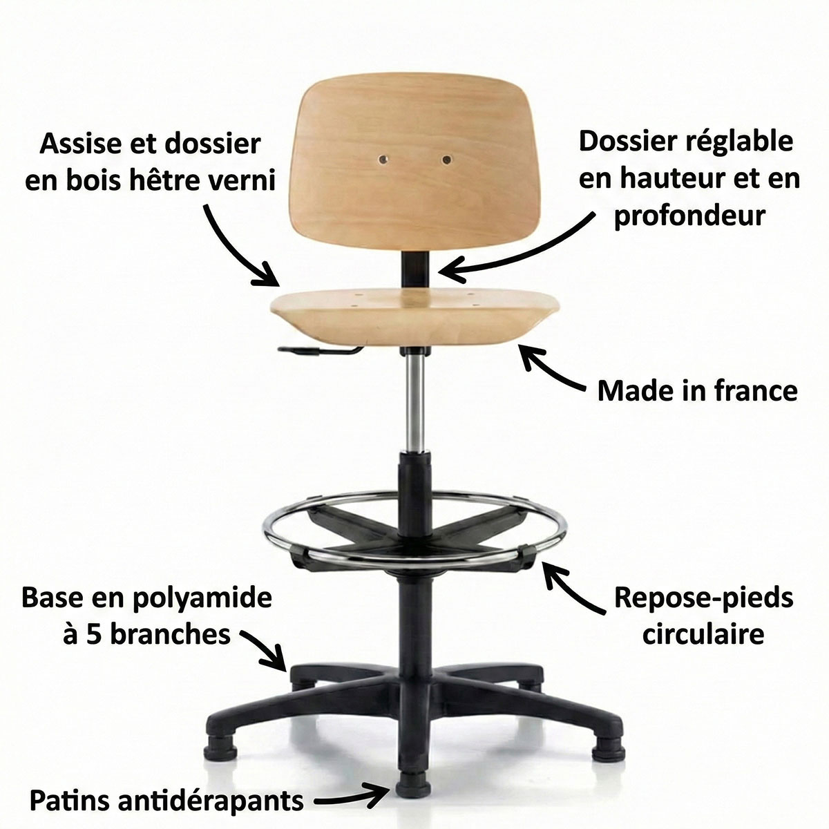 Sur les chaînes de montage, les postes de contrôle ou devant un établi, le matériel est mis à rude épreuve. Grâce à son dossier et son assise en bois vernis très résistant, le Tecnik TB2000 ne craint ni les rayures, ni la poussière, ni les salissures (huiles, graisses). Son nettoyage est rapide et efficace, garantissant une longévité exceptionnelle même en usage intensif. Son piétement giratoire ultra-stable à 5 branches sur patins assure une sécurité optimale autour des machines.