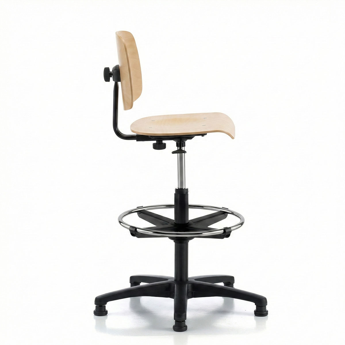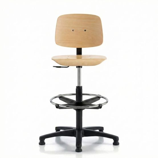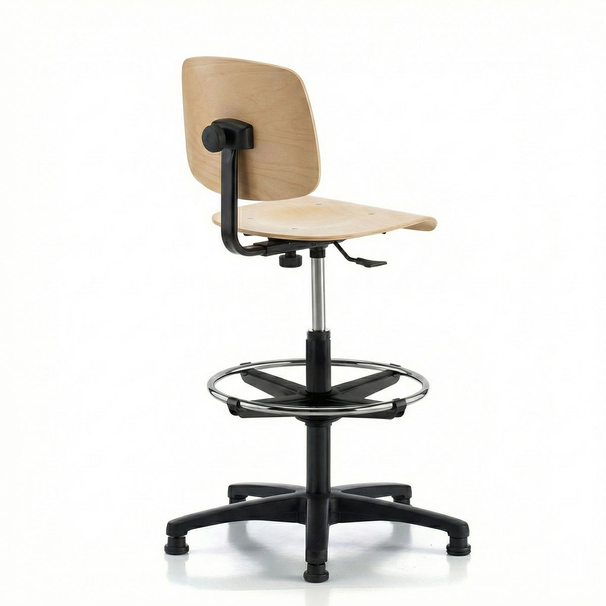 Les techniciens de laboratoire travaillant sur des paillasses hautes ont besoin de mobilier stérile et facile à désinfecter. Le bois vernis de l'assise et du dossier offre une surface lisse, sans porosité, idéale pour résister aux produits chimiques et faciliter l'entretien quotidien, tout en offrant une assise confortable pour les tâches nécessitant une grande concentration.