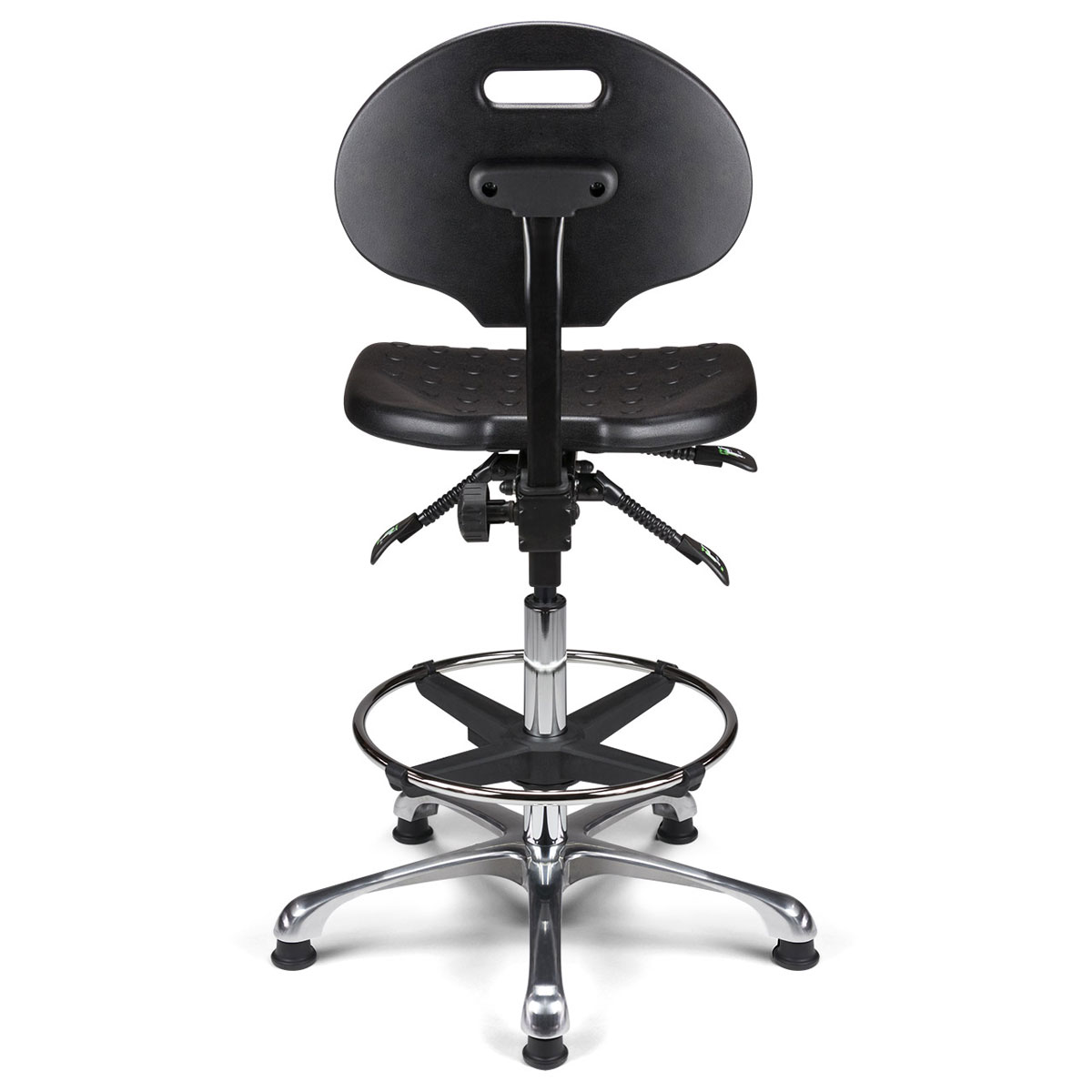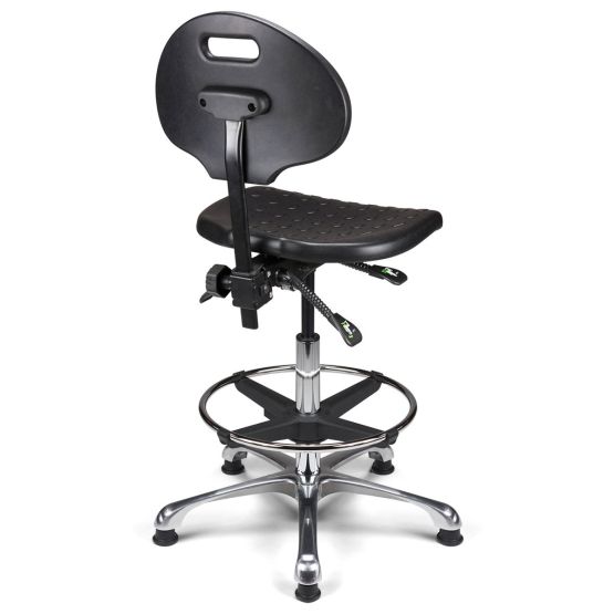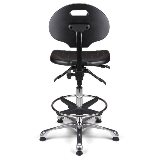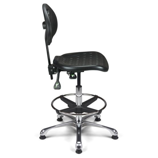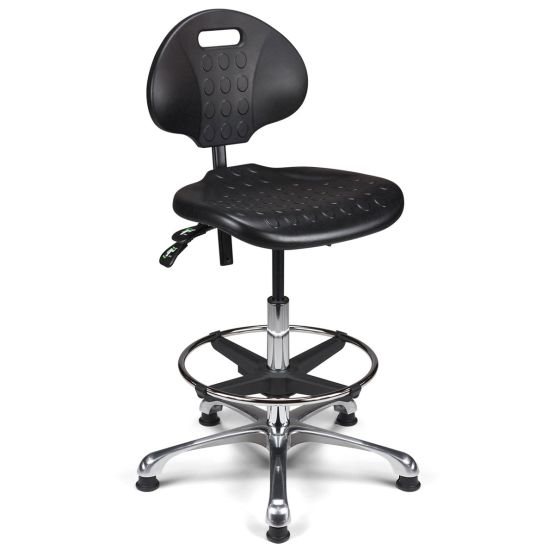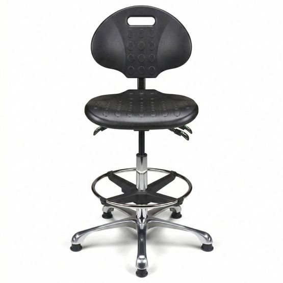 Dans un environnement industriel ou médical, le mobilier fait face à des contraintes fortes (poussière, solvants, frottements). C'est pourquoi l'assise et le dossier de ce siège sont fabriqués en polyuréthane noir haute densité. Ce matériau est reconnu pour son extrême résistance aux chocs, sa facilité d'entretien et son imperméabilité, garantissant ainsi une longue durée de vie à votre investissement.