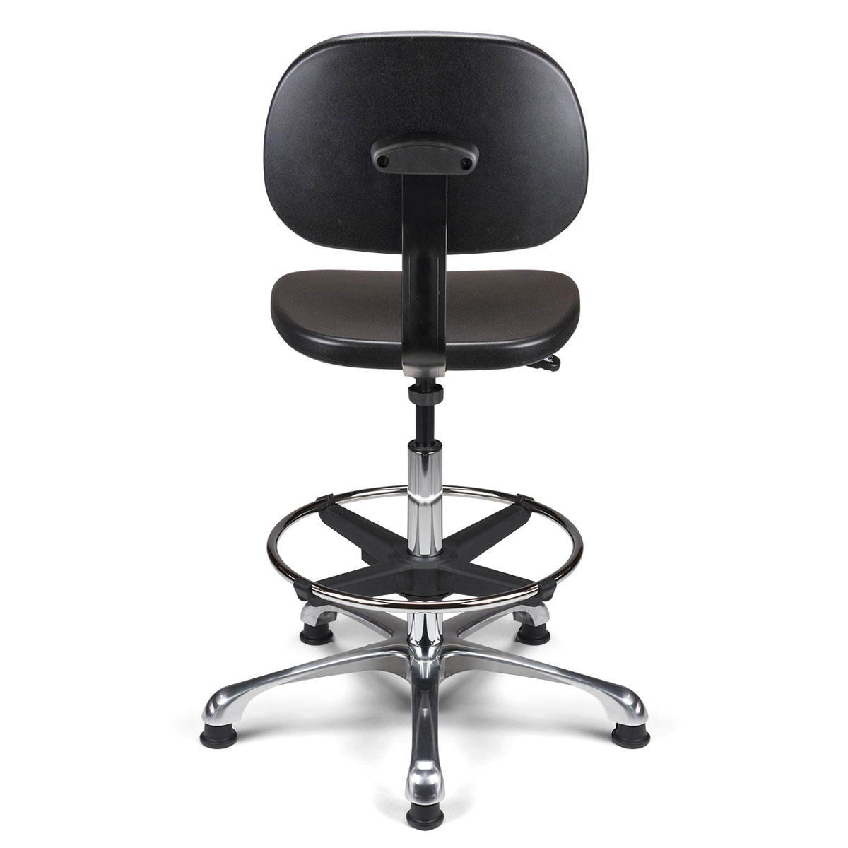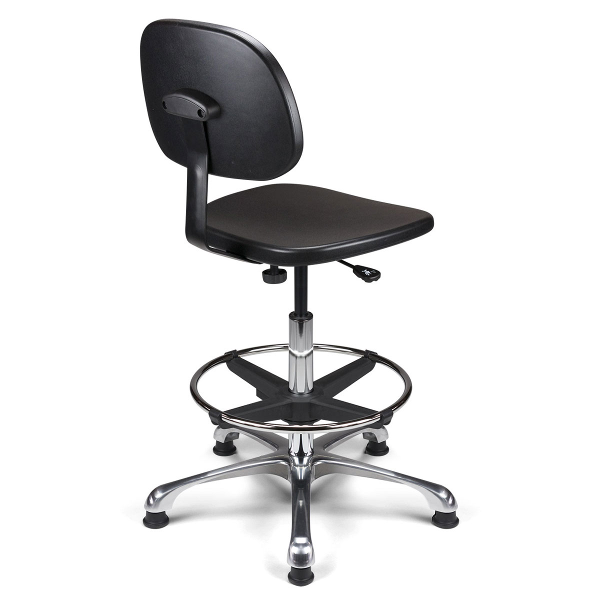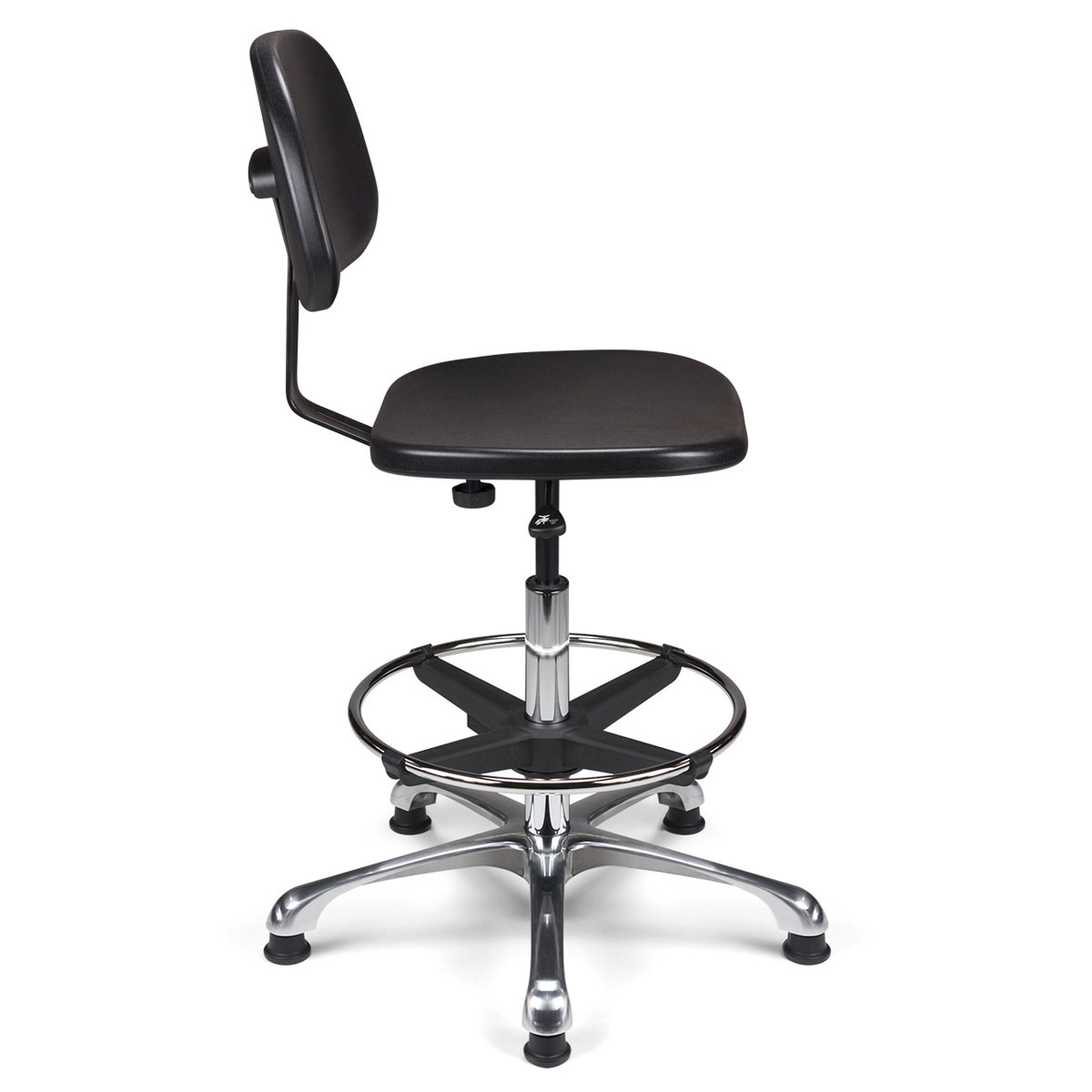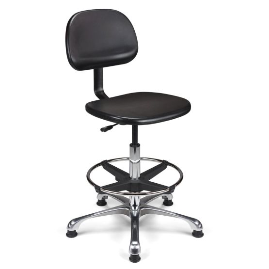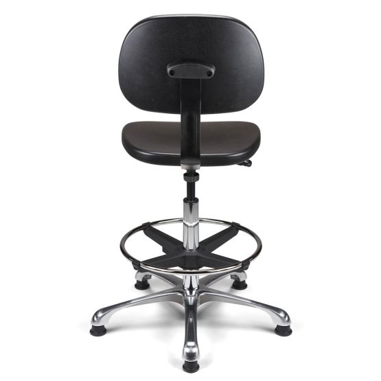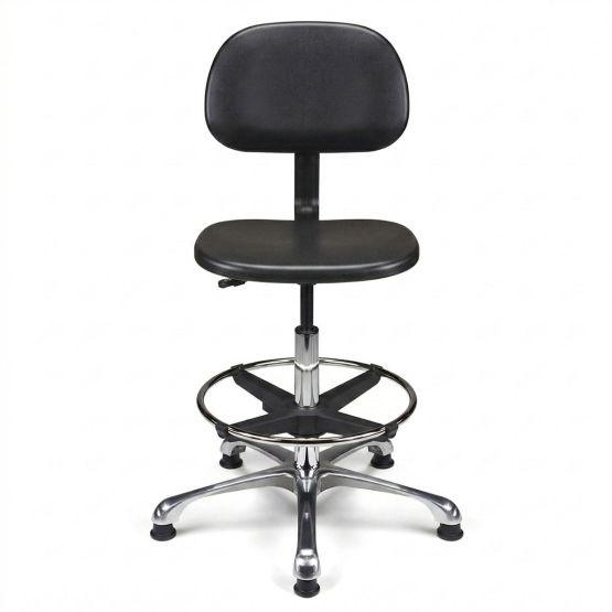 Dans un environnement technique (industrie, chimie, mécanique), le mobilier est soumis à rude épreuve. C'est pourquoi ce siège est équipé d'une assise et d'un dossier en polyuréthane noir haute densité. Ce matériau est plébiscité par les professionnels car il est non seulement extrêmement résistant à l'usure, mais aussi très facile à nettoyer. La solidité de l'ensemble est renforcée par une liaison assise-dossier assurée par une lame en acier finition époxy noir.