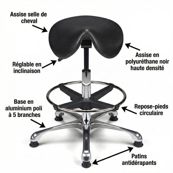 La sédentarité et les mauvaises postures entraînent souvent des douleurs lombaires et une fatigue prématurée. Ce modèle se distingue par son assise selle ergonomique en polyuréthane HD. Ce design spécifique permet d'ouvrir l'angle du bassin, favorisant ainsi un alignement naturel de la colonne vertébrale.