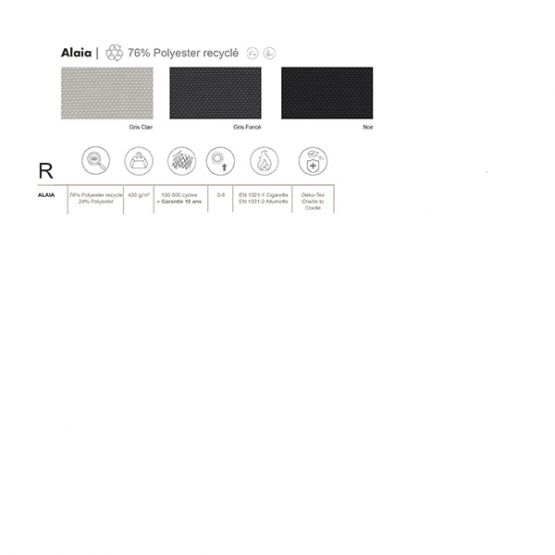 Comme pour l’Alaia tapissé, l’assise est composée d’une mousse polyuréthane HR injectée à froid d’une densité d’assise de 62 kgs/m3 d’une épaisseur de 50 mm.