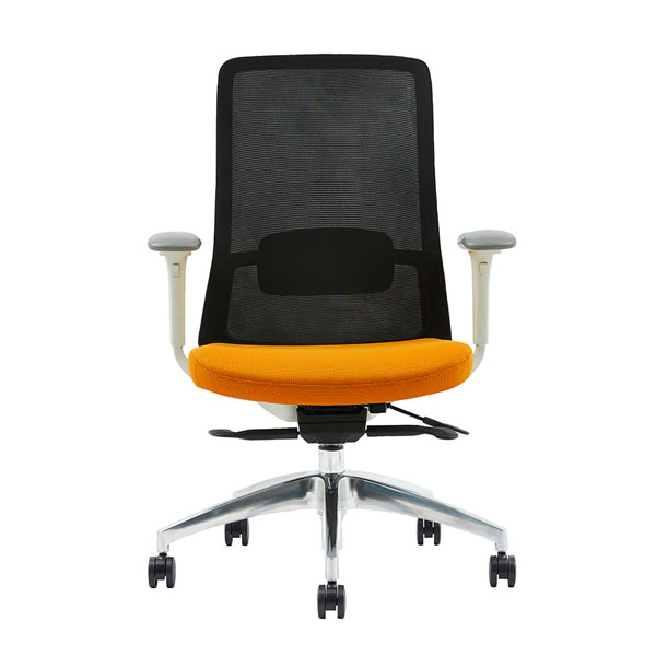 Le fauteuil est doté d'un piètement en aluminium poli, qui lui donne un aspect élégant et contemporain, ainsi que d'un enjoliveur gris à l'arrière du dossier. Il est disponible en plusieurs couleurs pour s'adapter à tous les environnements de travail.