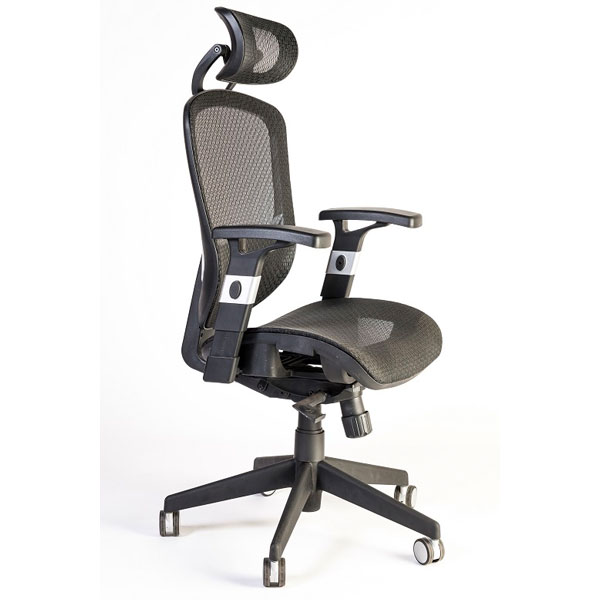 Fauteuil synchrone en maille, sans mousse, accoudoirs réglables en hauteur et profondeur, appui-tête réglable en hauteur et pivotant, soutien lombaire