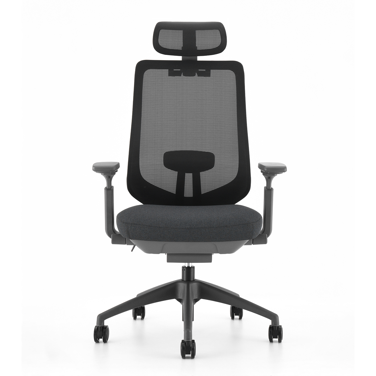 L'Owen est conçu pour s'adapter à toutes les morphologies. La profondeur d'assise est réglable avec précision par molette (translation d'assise), un atout majeur pour soutenir l'intégralité des cuisses et éviter la compression derrière les genoux. Les accoudoirs sont 4D réglables (hauteur, profondeur, largeur, pivotement) et sont équipés de manchettes soft touch, permettant d'aligner parfaitement les avant-bras avec le plan de travail pour relâcher les épaules.